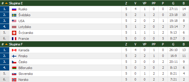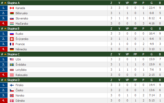 | 13. | Dánsko | 3 | 3 | 0 | 0 | 0 | 13:4 | 9 | |